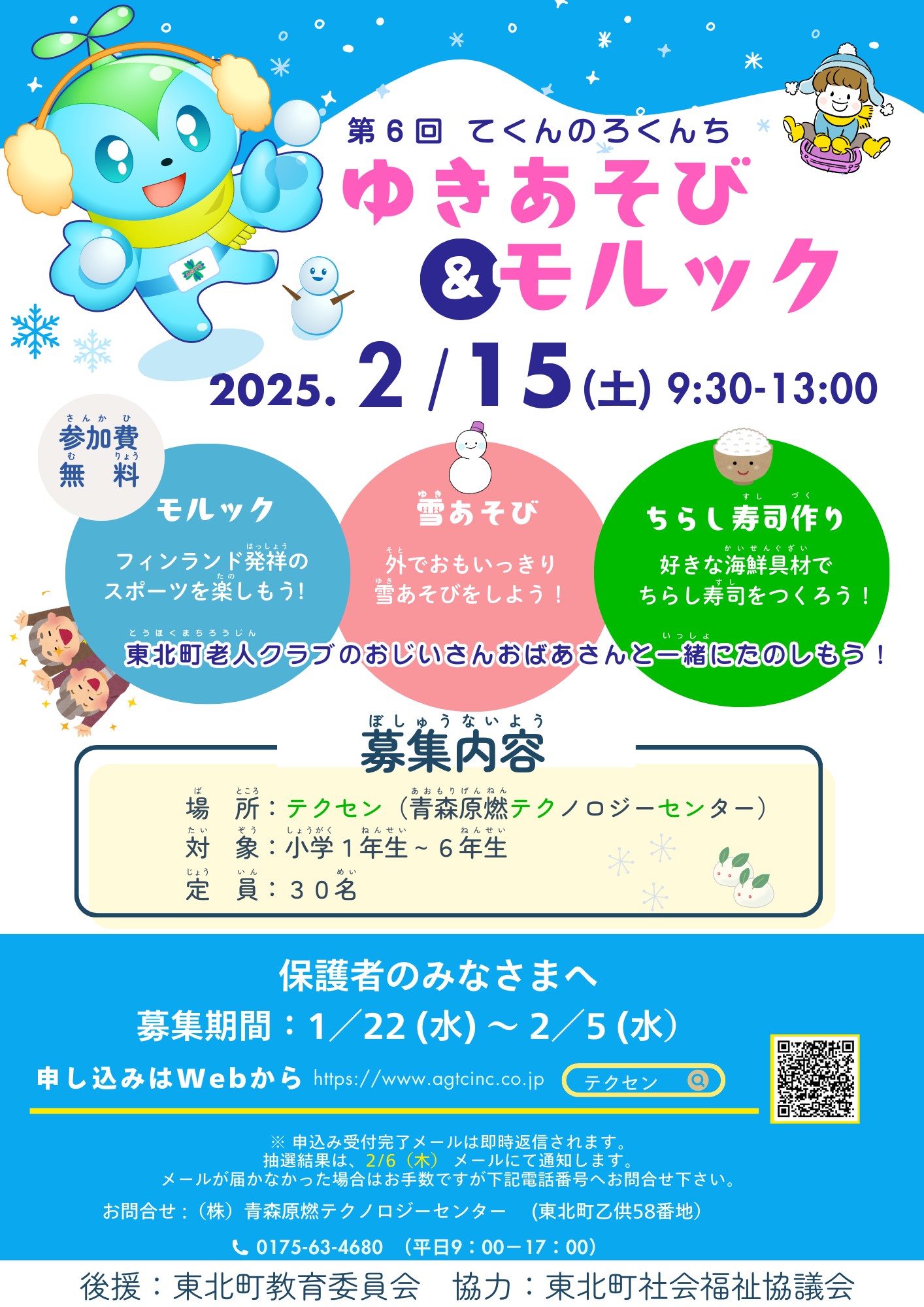 第6回てくのろくんち 雪あそび&モルック 申し込み時の注意事項 お申込み時【備考欄】へのご記入をお願いいたします。 来訪時間と帰宅時間 食べ物にアレルギーのある方は、アレルギーの種類 印刷用PDFのダウンロード、セミナーの申し込みはこちら 印刷用PDFはこちら
