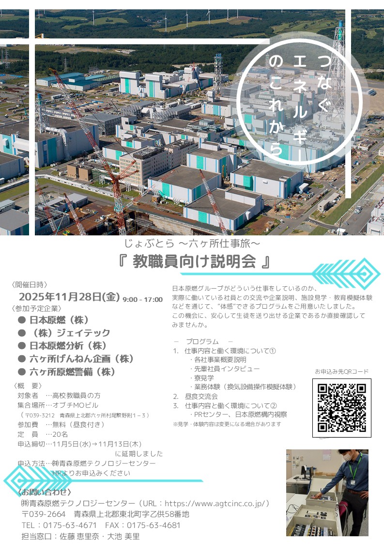 じょぶとら~六ヶ所仕事旅~「教職員向け説明会」 申し込み時の注意事項 食べ物にアレルギーのある方は、【備考欄】にアレルギーの種類もご記入ください。 印刷用PDFのダウンロード、セミナーの申し込みはこちら 印刷用PDFはこちら