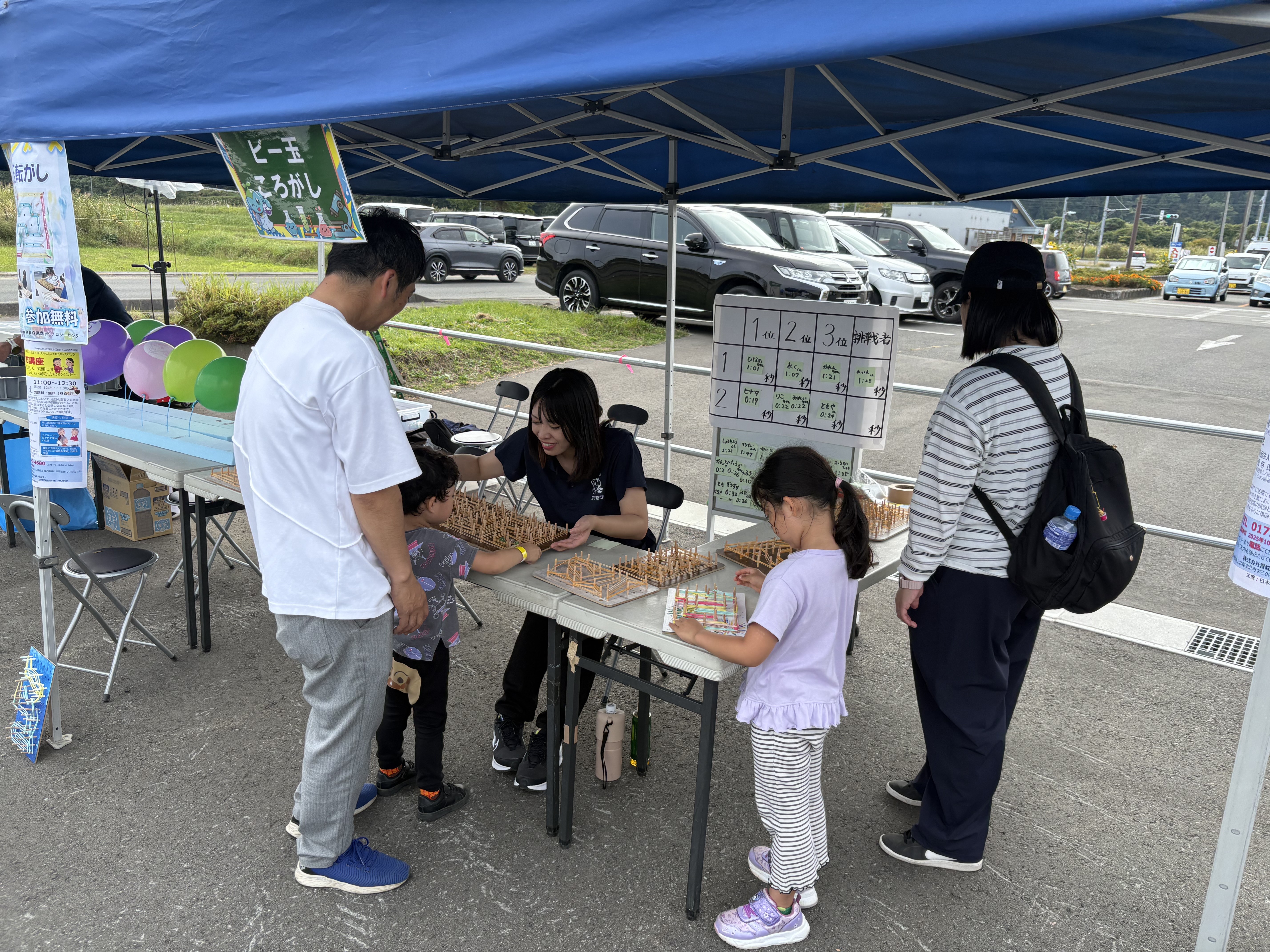 輪ゴムで張り巡らされたボードの上で上手にビー玉を転がしながら迷路をクリアする「ビー玉転がしタイムアタック」を体験していただきました。簡単なコースから難しいコースと段階を経て、ベストタイムをねらいチャレンジする子がたくさんいました。