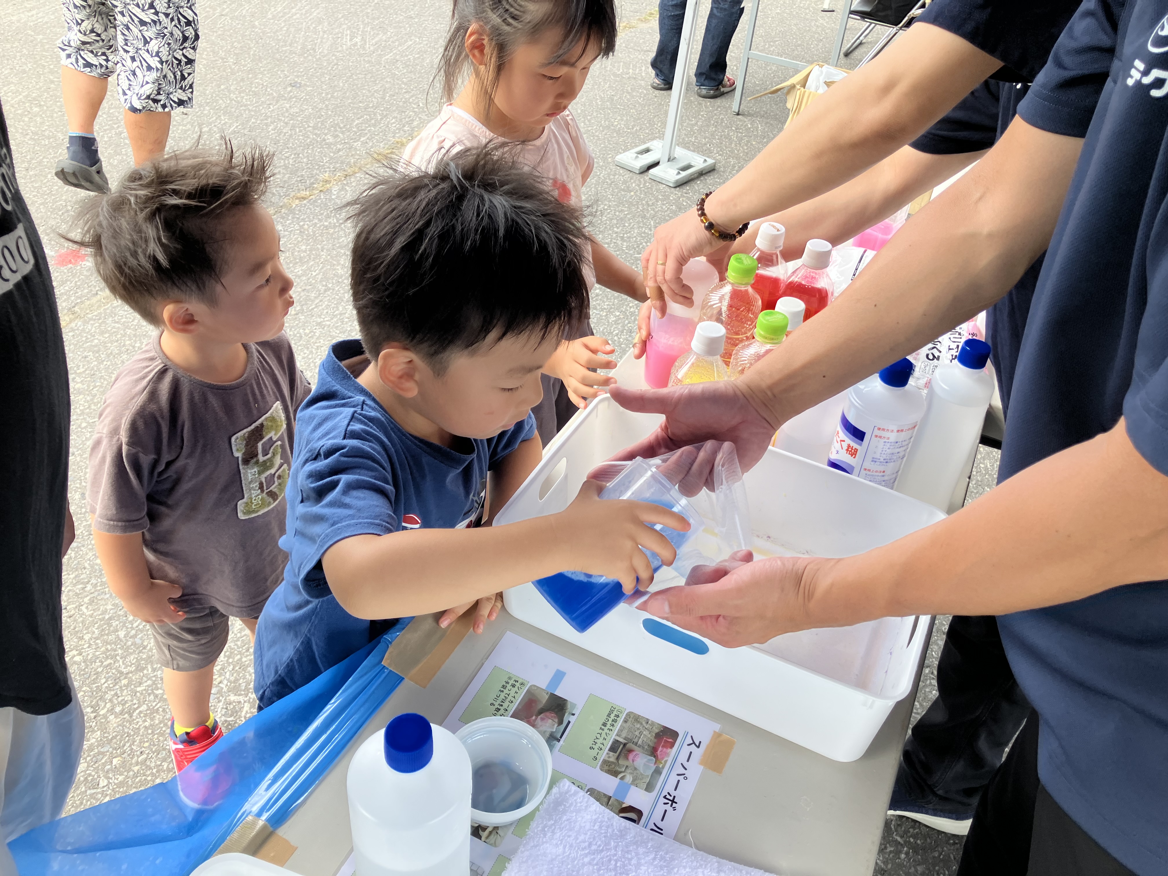 絵具を溶かしたカラフルな洗濯のりと水を専用のカップに入れて、よくかき混ぜたのちに魔法の水“ホウ砂水”を少しづつ流し入れ、ゆっくりかき混ぜて出来上がる「スライム」作りを楽しく体験していただきました。いろいろな形や硬さのスライムを完成させて、お持ち帰りいただきました。