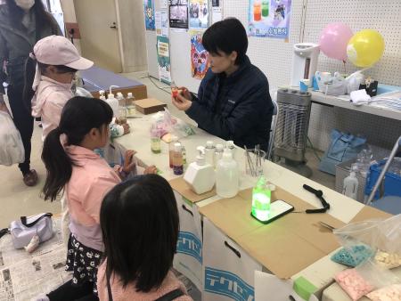 二層に分かれた水と油が入った容器に炭酸入浴剤を入れて、炭酸のマグマを作る体験をしていただきました。好きな色の入浴剤を選んだ後は、ぶくぶくと浮き上がる様子を不思議そうに見ながら喜んでもらい、完成後は観賞用として持ち帰っていただきました。