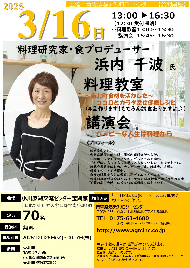 料理研究家・食プロデューサー 浜内 千波氏 料理教室 申し込み時の注意事項 料理教室の会場の都合により、実際に料理体験(調理)できる定員を35名とさせていただきます。 備考欄へ、「見学希望」「体験希望」「見学・体験どちらでもよい」いずれかを記載願います。 体験希望者が多数の場合は抽選となりますのでご了承願います。 印刷用PDFのダウンロード、セミナーの申し込みはこちら 印刷用PDFはこちら