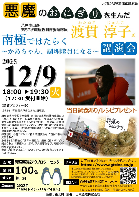 地域活性化講演会 南極ではたらく ~かあちゃん、調理隊員になる~ 講師:渡貫 淳子 氏 申し込み時の注意事項 ◆受付は17:30~18:00となります。 ◆お申込み時【備考欄】へのご記入をお願いいたします。 緊急時の連絡先 食べ物にアレルギーのある方は、アレルギーの種類 印刷用PDFのダウンロード、セミナーの申し込みはこちら 印刷用PDFはこちら